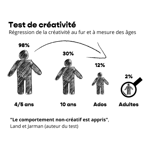 Comme l'illustre le schéma associé, la créativité diminue au fur et à mesure des âges... Notre éducation, trop didactique ne nous a pas appris à penser par nous-mêmes de manière créative ni à développer notre esprit critique ou à considérer autrui.